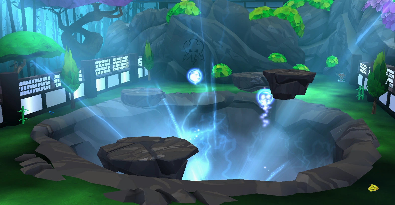The Lightning Garden is the first Lightning location players will encounter. Beyond it is the Lightning Dojo. In the middle of the garden, there is a deep pit with floating lightning balls and platforms.