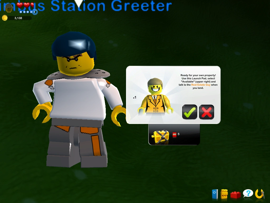The Nimbus Station Greeter was located on the hill up to the Avant Gardens launchpad, very close to where The Battle of Nimbus Station is today. There, he gave a mission to fly to Cul-de-sac, talk to Guy the Land Agent (whom he refers to as a Real Estate Guy), and claim the property.