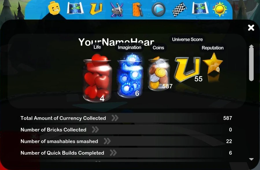A player's Passport records their progress in LEGO Universe, from missions and achievements to how many times a player has been smashed or how far they have traveled. It can be accessed by clicking on the blue book icon in the lower right corner of the screen, or by pressing the 'P' button on the keyboard. It should be noted that Daily Missions are not recorded in the Passport.